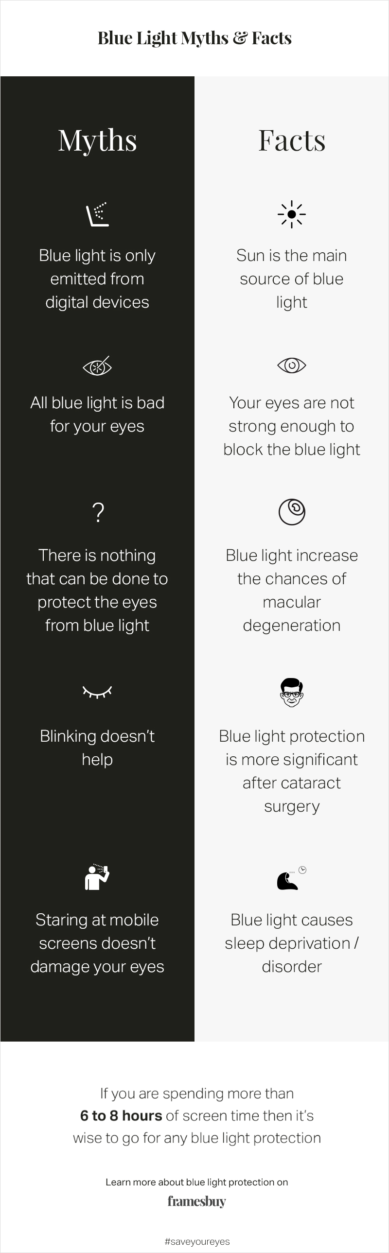 Considering the myths and facts, one thing is for sure, you should be worried about the harmful blue light. Your eyes are not designed to tolerate the negative impact of the artificial blue light.